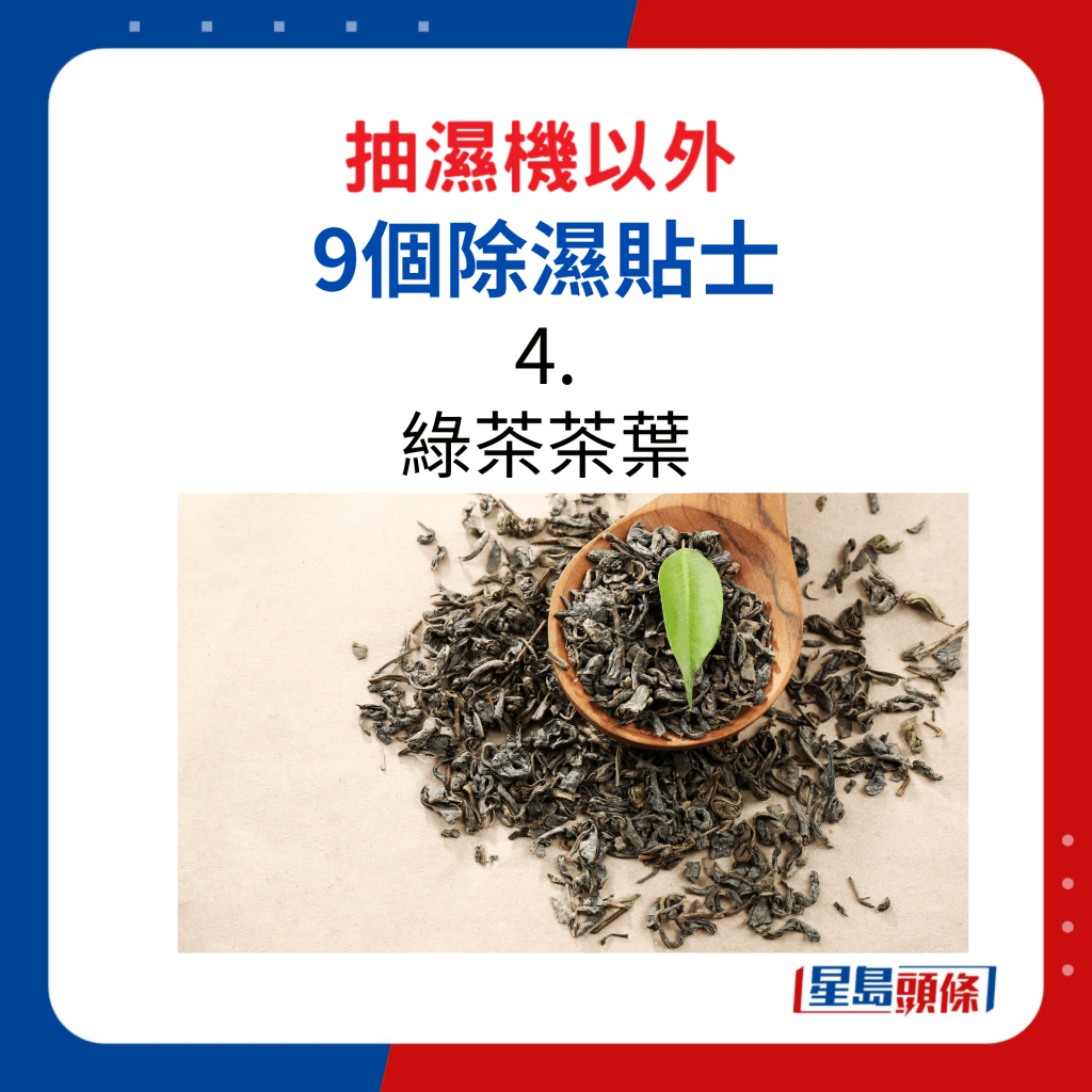 綠茶的茶葉含有鞣質成分,可除濕及除霉,只需將綠茶茶葉或茶包放置衣柜或鞋柜中便可吸濕。