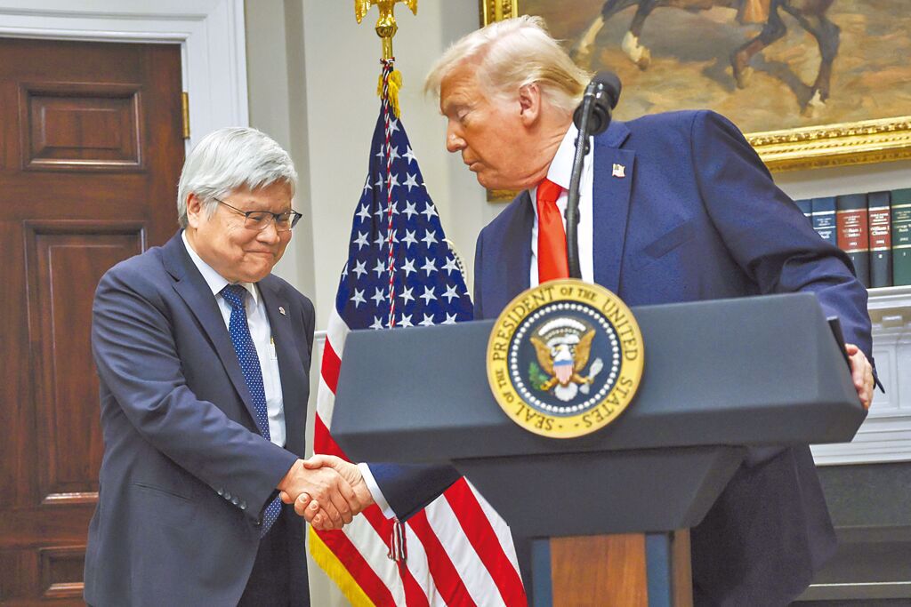 ▲特朗普稱贊魏哲家(圖左)是傳奇,“是現在會議室里最重要的人”。美聯社