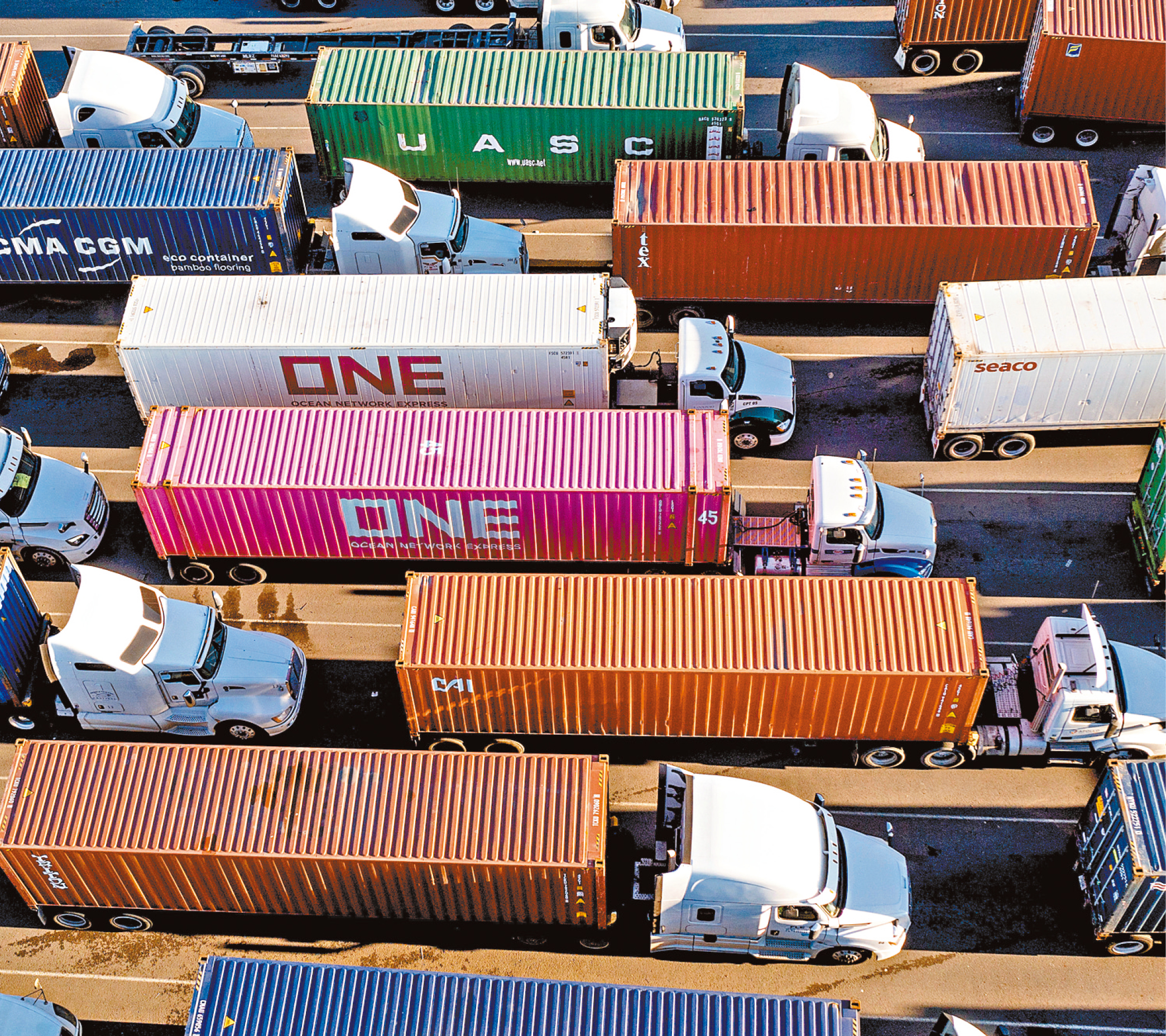 ▲關稅戰開打勢必影響民生。圖為貨車排隊進入屋侖港口。美聯社資料圖片
