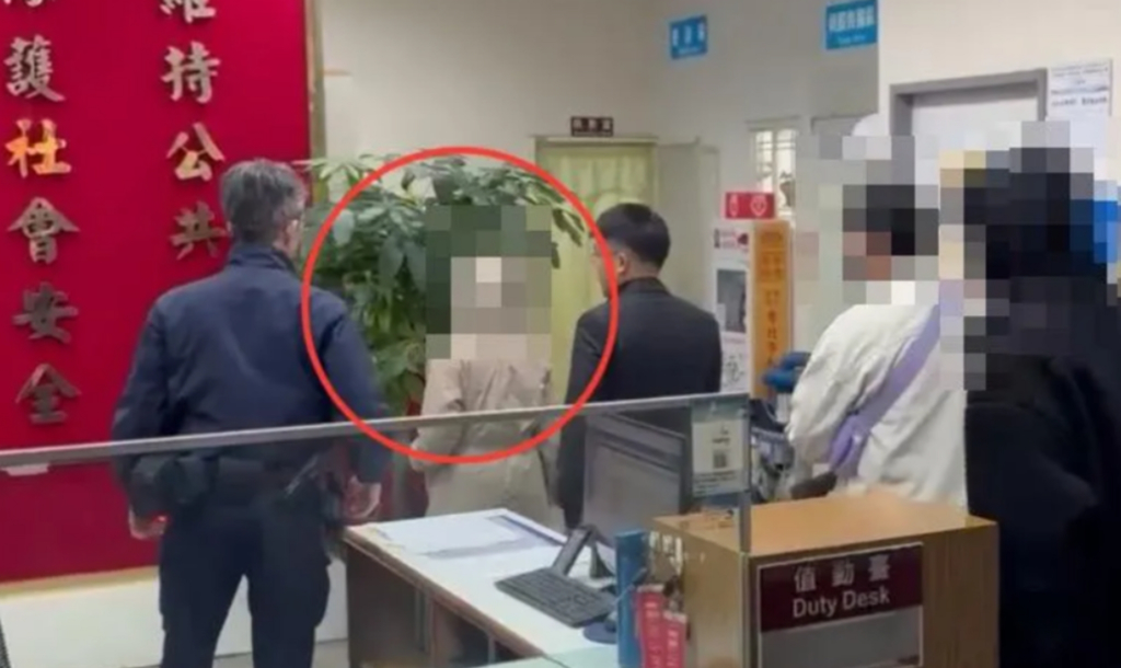 ▲梁妻(紅圈處)做完筆錄低頭不語離開警局。(翻攝中天新聞)