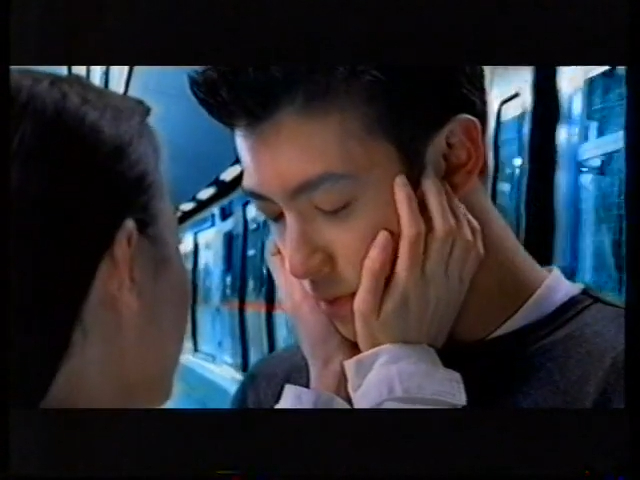 ▲二人在模擬當年仍在興建中的港鐵將軍澳線同九鐵的馬鞍山鐵路車廂內親熱,張柏芝十分主動地靠近陳冠希并咬對方耳仔。