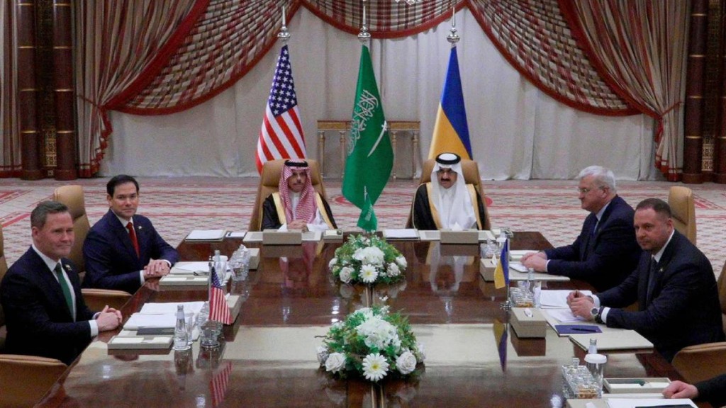 ▲美國國務卿魯比奧(左2)在沙特阿拉伯與烏克蘭代表,商討俄烏戰爭?;鹗乱?。 路透社