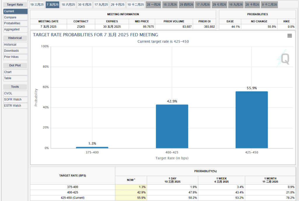 ▲FedWatch顯示,市場預期聯儲局5月減息的機率,已急升至逾四成。