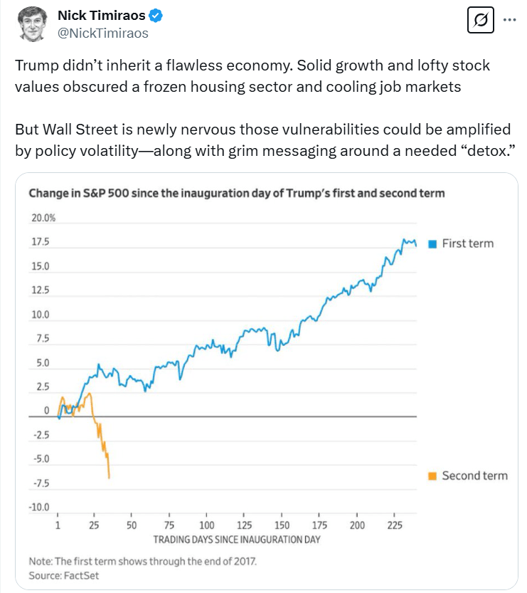 有“聯儲局線人”之稱的《華爾街日報》Nick Timiraos指出,美國政府過去一直為經濟“軟著陸”下苦功,力求不引發經濟衰退下降低通脹,但直至今年,特朗普團隊已多番表示,對于關稅政策導致投資風險毫不關心,亦認為一些開支及招聘要進行“排毒”,短期內通脹亦將上升。