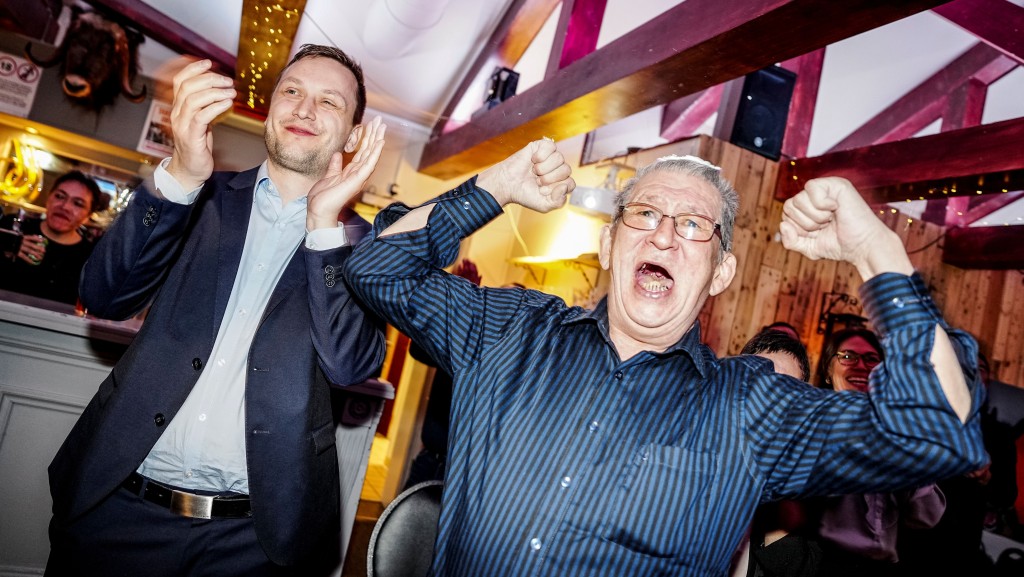 ▲格陵蘭選舉結束,民主黨(Demokraatit)黨魁尼爾森(左)慶祝勝選。美聯社