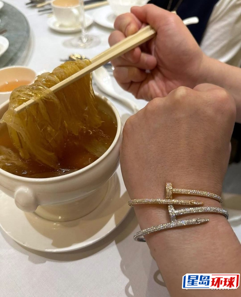▲戴每只價值38萬的卡地亞手鐲吃天九翅。
