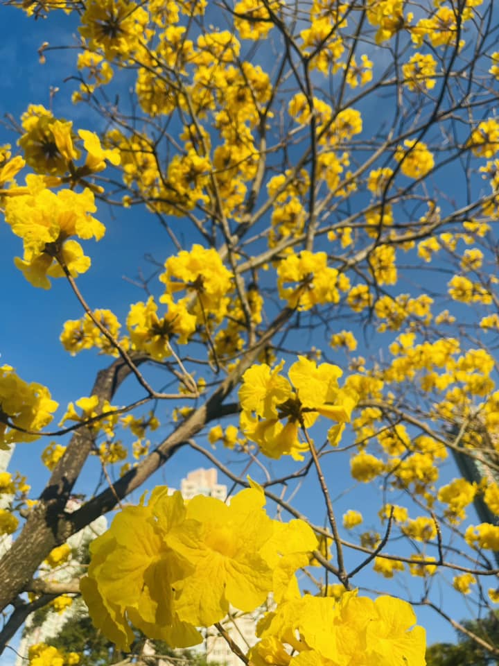 要賞花不一定要到郊外,在社區里的尋常街道,只要細心觀察,也會有意外驚喜。南昌公園多年前種植了多棵黃花風鈴木,至今已長得茂密茁壯,當每年三、四月天氣回暖,鮮艷奪目的黃花便開滿枝頭,拍起照來特別搶眼。