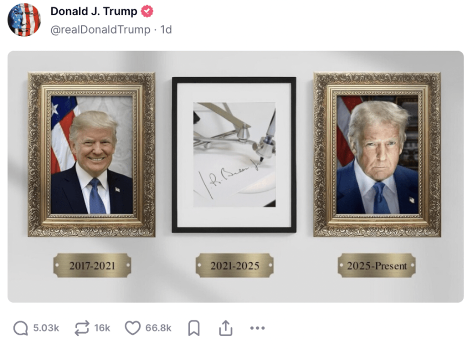 在特朗普發布以上言論前一日,即16日,他在Truth Social上發布了一張圖片。圖片中有三張相,第一張是他第一任期的官方肖像照,第二張是一支自動簽名筆正在簽署“喬·拜登”的名字,第三張是特朗普第二任期的官方肖像照,以諷刺拜登在總統任期內使用自動簽名筆代簽。