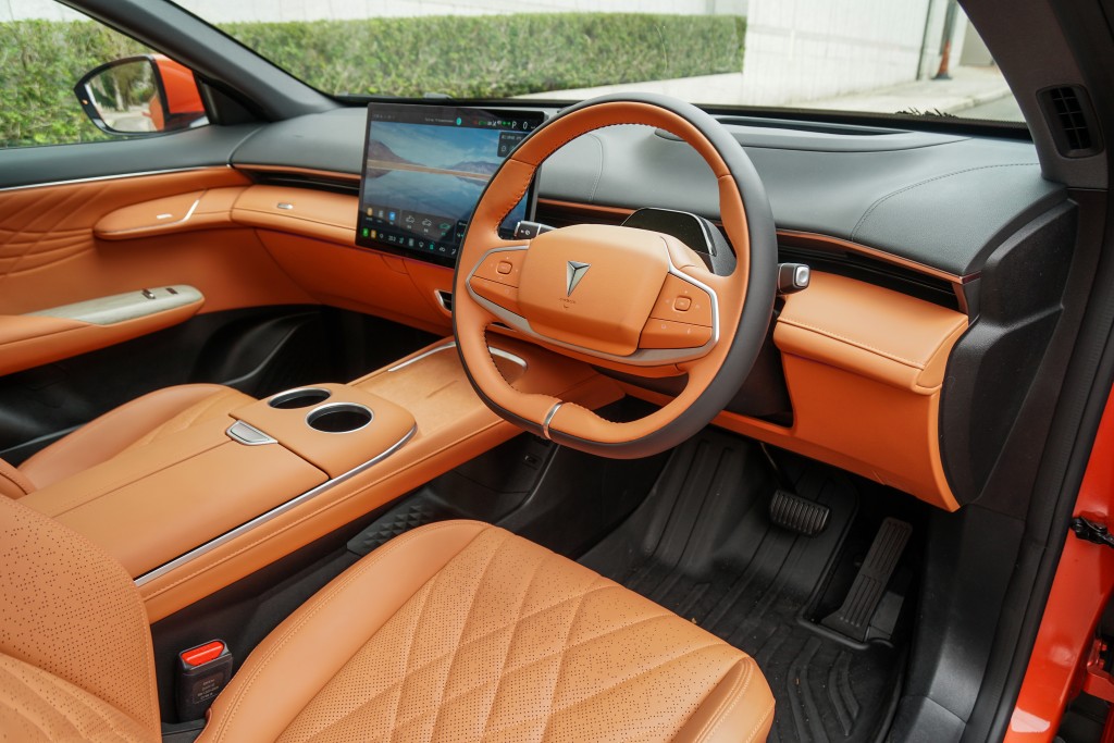 ▲Deepal深藍S07標準續航版試駕:環抱式車廂用料與造工皆上乘,并提供橙或黑兩色配搭。