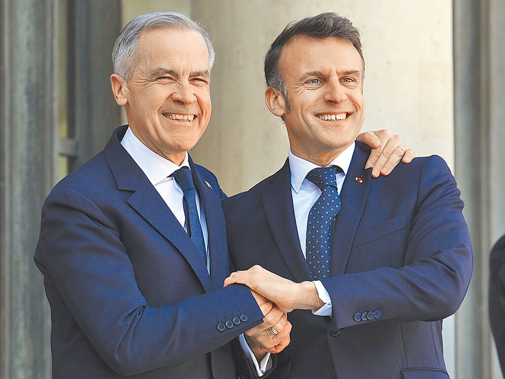 ▲加拿大新任總理卡尼(左)17日展開首度海外訪問,在巴黎受到法國總統馬克龍(右)的熱情迎接。美聯社