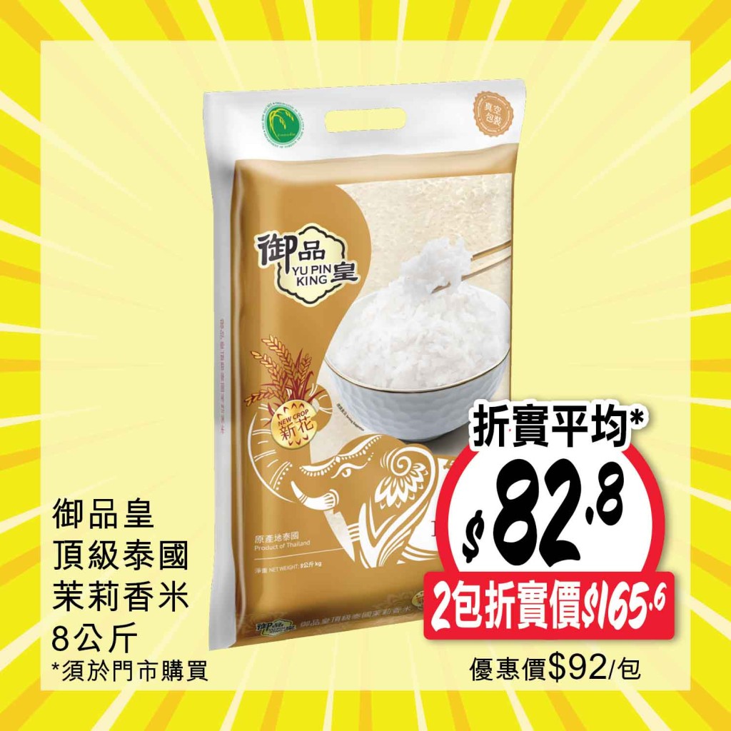 即日起至3月20日(四),凡于惠康門市選購食米或食油產品滿$120,或惠康網店購物滿$180,并于結帳時輸入相關折扣碼,便享有9折優惠,精選推介金象牌頂上茉莉香米8公斤 $89.9;獅球嘜純正粟米油3支裝 $74.9;刀嘜純正花生油3支裝 $66.6等,趕快趁著快閃優惠,入手日常所需的油米!