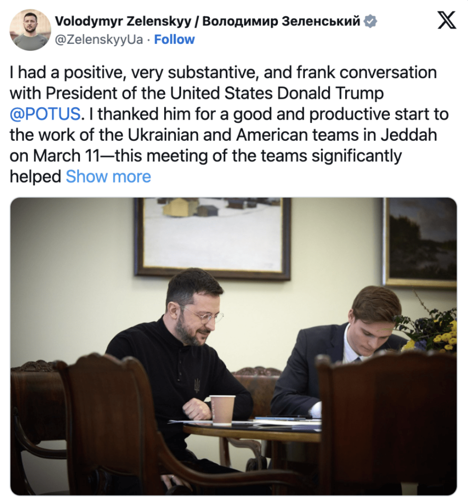 簡報稱,兩位領導人還就俄烏雙方針對能源基礎設施的局部?;疬_成共識,技術團隊將于未來幾天在沙特阿拉伯會面,討論如何將?;鸱秶鷶U展到黑海,并朝著全面?;疬~進。