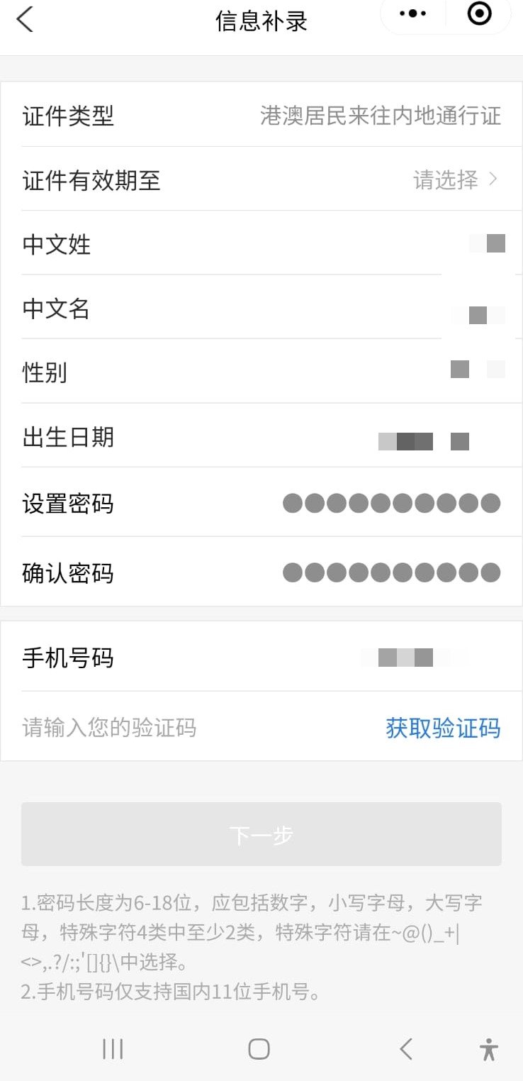 如遺失回鄉證,可先在征信、支付寶小程序搜查移民局12367應用程序,點擊港澳臺區民來往內地(大陸)臨時通行證,進入登錄界面后,揀選港澳居民來往內地通行證,輸入姓名及證件號碼,再根據指示輸入有關資料,包括出生日期、設置密碼、手機號碼等,惟記者輸入香港手機號碼時,則顯示手機號碼不正確,相信要輸入內地的電話號碼以獲取驗證碼。