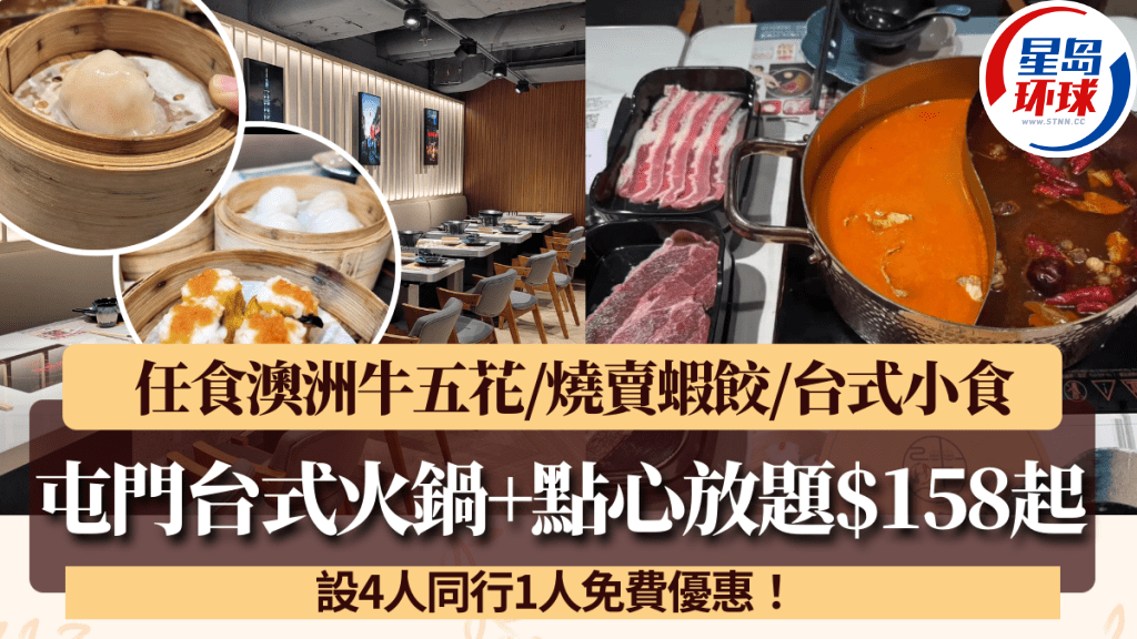 屯門臺式火鍋+點心雙重放題$158起!屯門一間主打手作點心及火鍋放題餐廳推出臺式火鍋加港式點心雙重放題,人均$158起就可以任食各款火鍋配料及港式點心,包括澳洲無激素穀飼牛五花、牛板腱、牛舌芯、蝦餃及燒賣等,同場更有多款臺式小食供應,最多食足兩小時,即日起更推出晚市優惠,四人同行一人即享免費,即睇詳情!