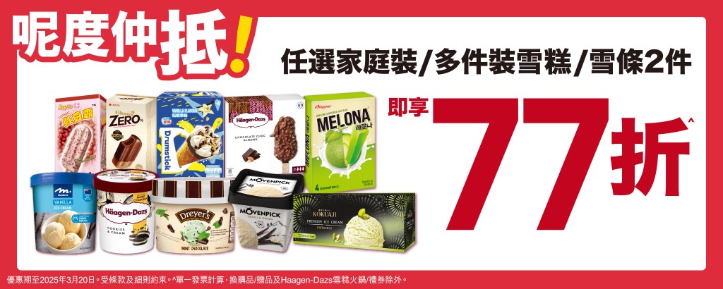 惠康優惠|惠康超級市場驚喜優惠不斷,于即日起至3月20日推出“雪糕感謝祭”,凡于惠康門市或網店購買任何家庭裝或多件裝雪糕或雪條2件,便可享有77折優惠,以至抵價入手H?agen-Dazs、DREYER'S、MELONA等雪糕及雪條!