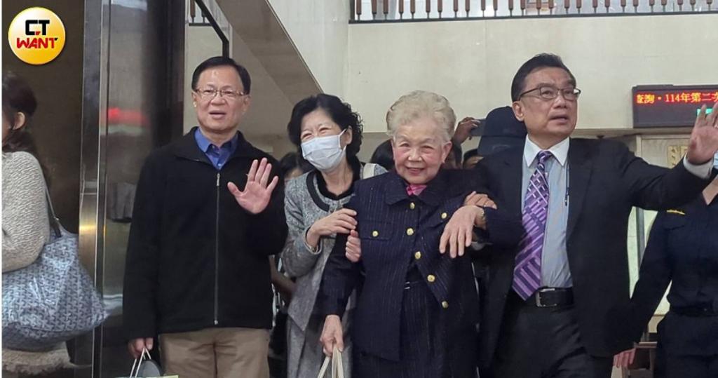 隨后,柯文哲的妻子陳佩琪與柯媽也在延押庭結束后緩步現身,身旁還有“立委”張啓楷與“立委”林國成在旁陪伴,陳佩琪一路攙扶柯媽上車,柯媽則微笑對著支持者揮手表示,“謝謝大家”,并搭車離開,一旁則有支持者不斷在旁大喊,“柯媽加油”、“佩琪加油”。