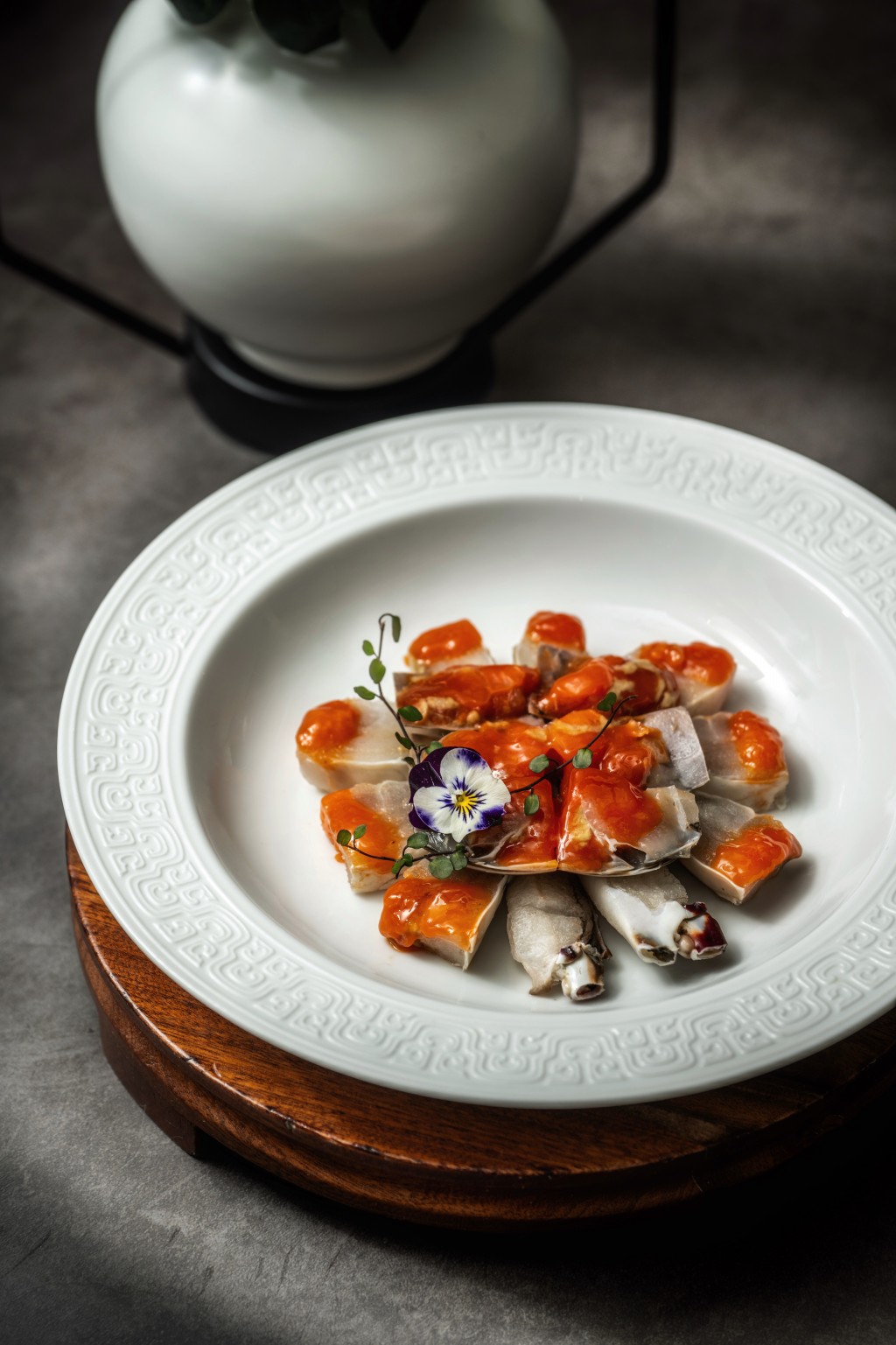 寧波咸熗蟹特別選用招牌菜十八斬的同款紅膏梳子蟹,劉師傅用海鹽腌制,除增加蟹肉的鮮味和香氣,還令蟹肉入口更綿密滋味。金湯扣鮑魚以黃湯為南非吉品干鮑提鮮,搭配寧波的夜開花瓜和日本米飯,吃起來軟糯有層次,味道十分鮮美。