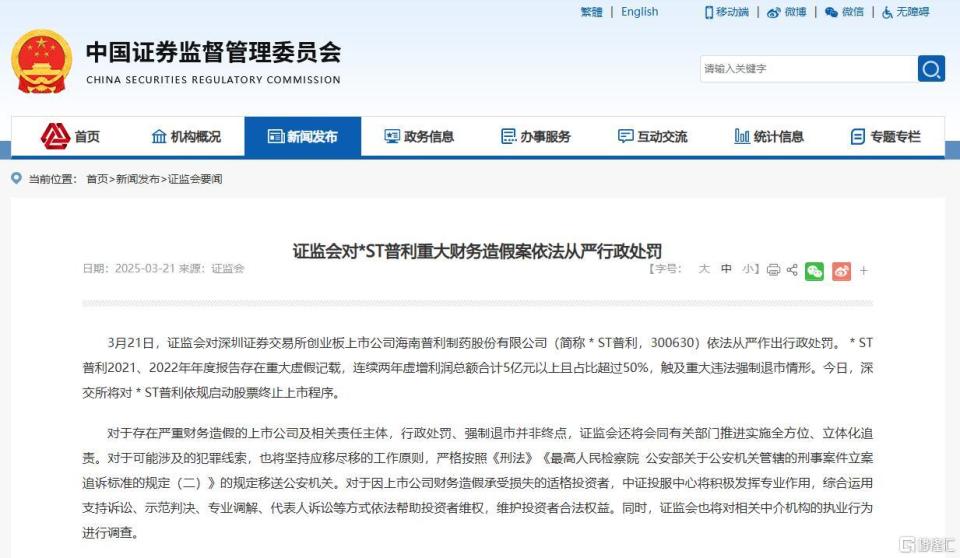 3月21日,證監會對深圳證券交易所創業板上市公司海南普利制藥股份有限公司(簡稱*ST普利,300630)依法從嚴作出行政處罰。
