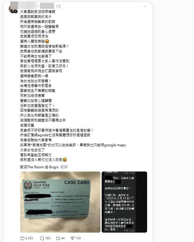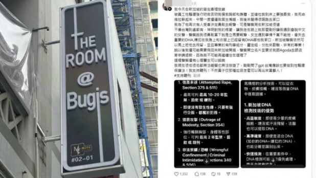 據女當事人在Threads發文指控,指在上周六(22日)下午4時42分,在其入住的新加坡武吉士The Room@Bugis酒店,被一名孟加拉裔男員工非禮。