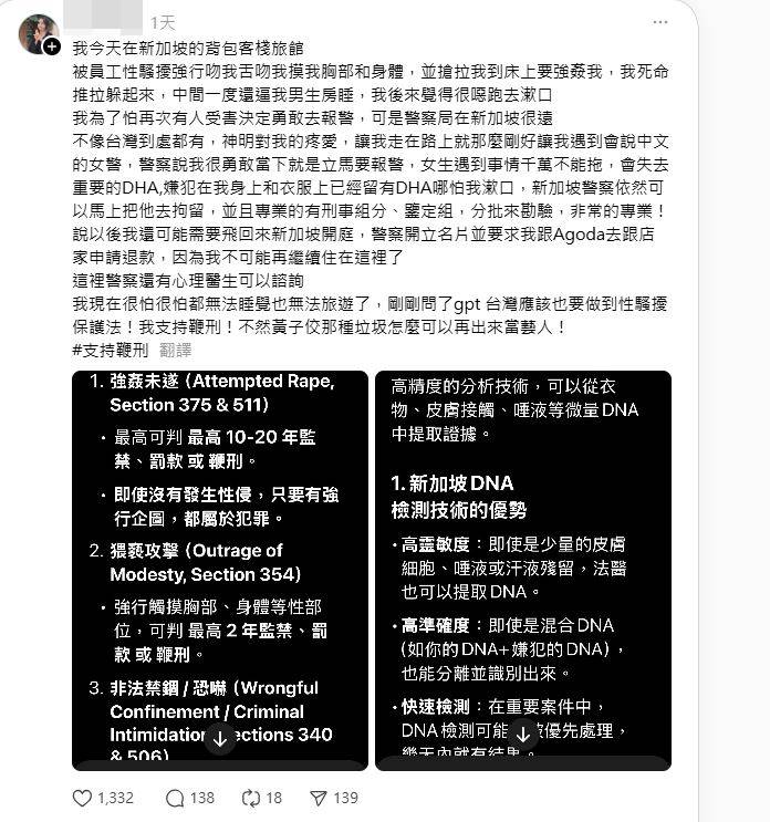▲女事主在新加坡的遭遇,引起臺灣媒體關注。 Threads