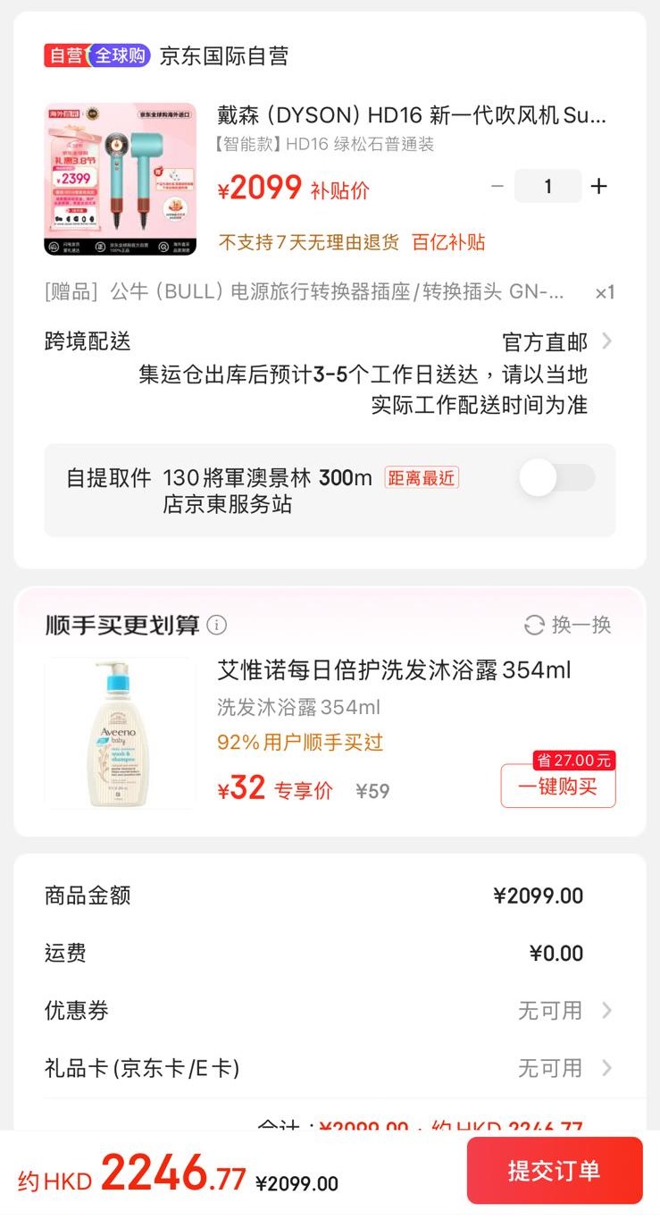 ▲Dyson“Supersonic Nural 風筒 HD16”的京東到手價為¥2099(約港幣$2246.77)