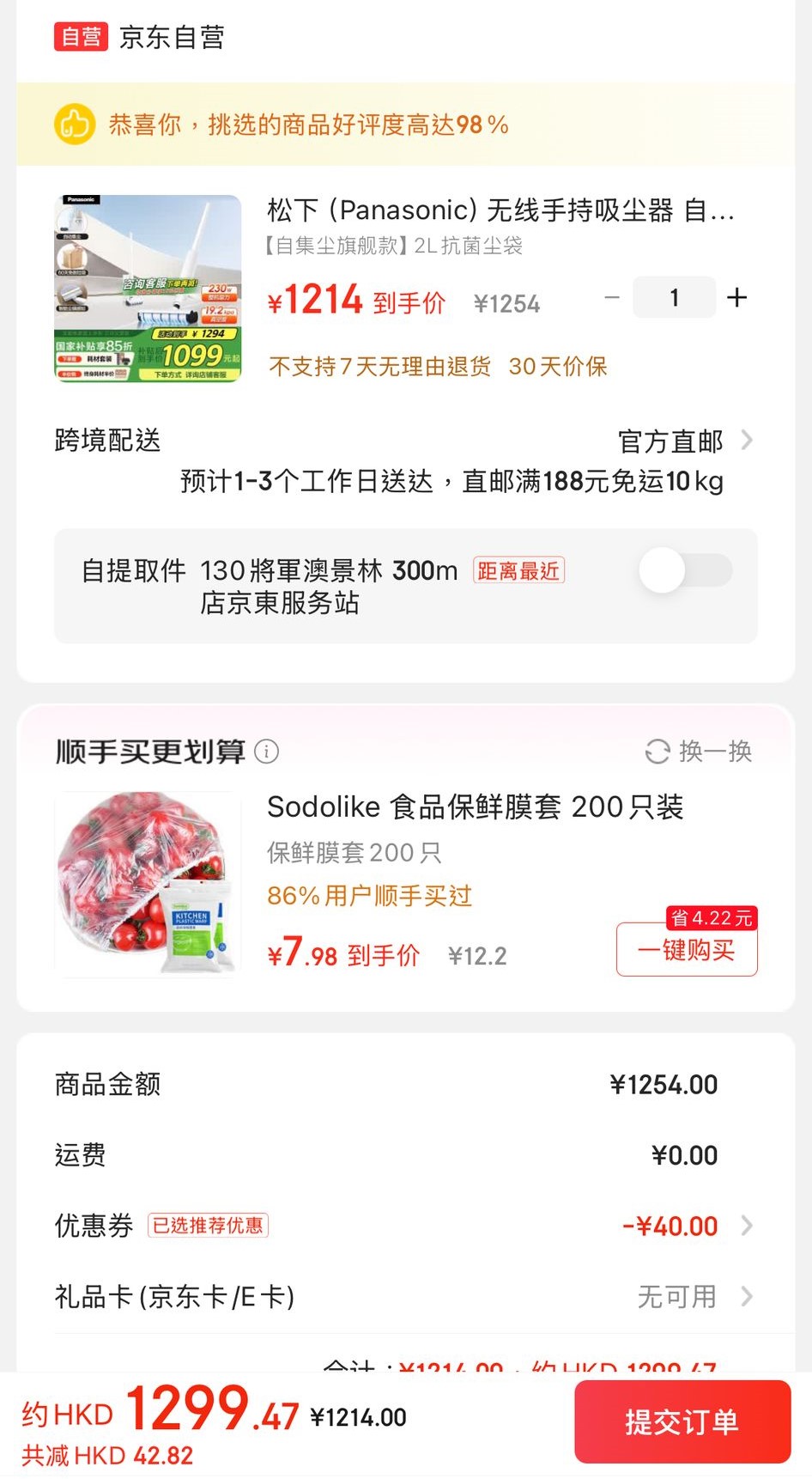 ▲Panasonic輕巧型無線吸塵機的京東到手價為¥1214(約港幣$1299.47)