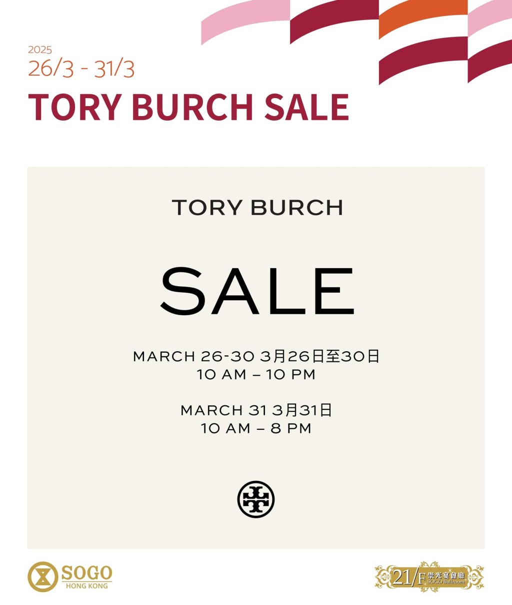 由即日起至3月31日,銅鑼灣崇光百貨21樓宴會廳舉行”TORY BURCH SALE”特賣展銷會,多款TORY BURCH手袋、銀包、服飾、鞋履及配件都有減價,部分款式及鞋款碼數售完即止,建議大家盡早前往選購心水款式!
