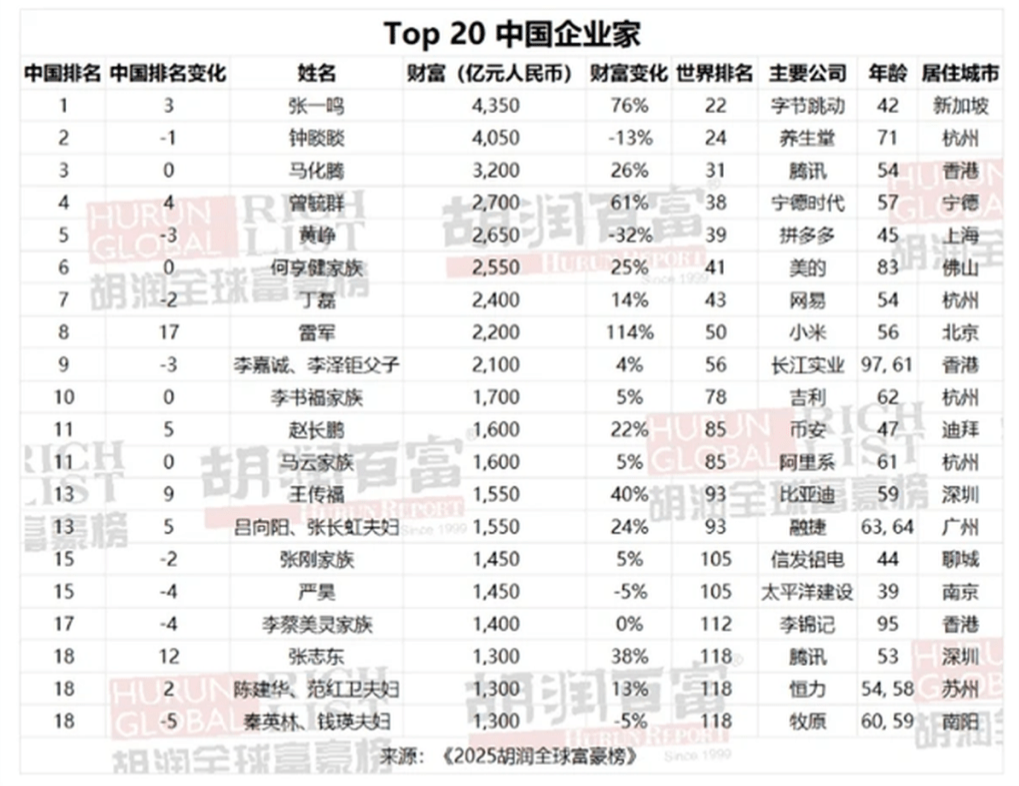 ▲胡潤百富榜,中國20大富豪排名。 胡潤全球富豪榜