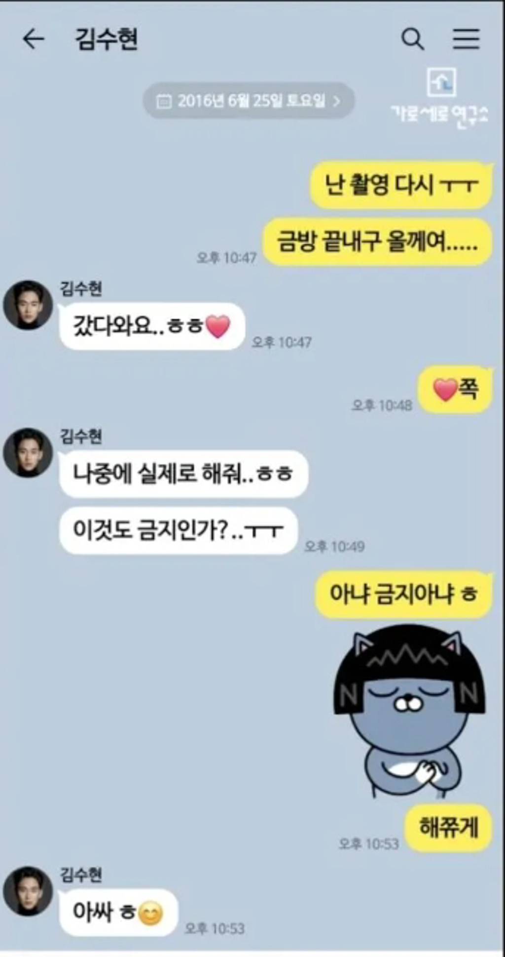 遺屬提供金賽綸過去與金秀賢交往的私密對話與書信,其中一則對話紀錄時間為2016年6月25日,內容可見,金賽綸先是傳出訊息向金秀賢報備行程,說明自己即將要去工作:“我又要去拍攝了(哭哭),我會趕快結束然后來找你……”,金秀賢則說:“去吧,嘿嘿”并附上愛心貼圖來安慰女方。