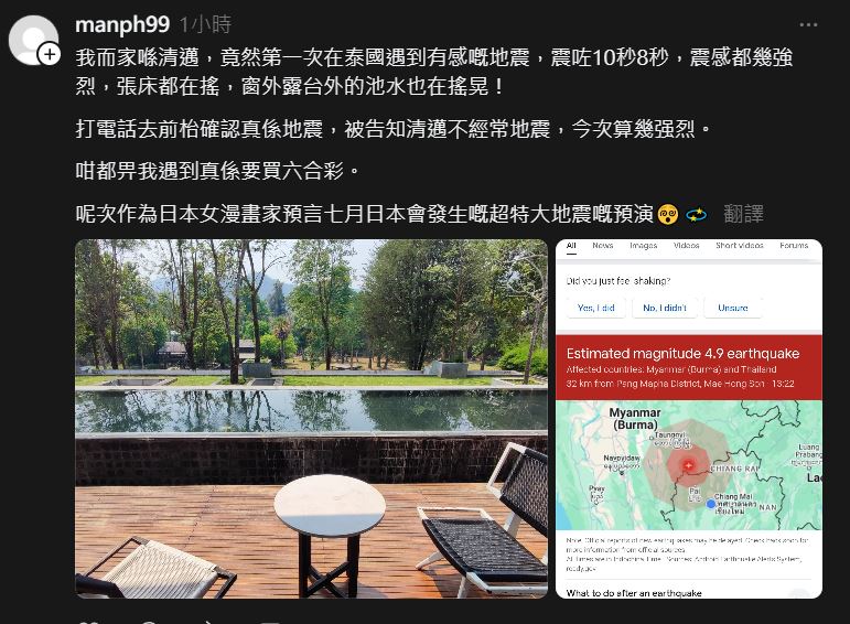 另外,亦有身處清邁的港人在社交平臺發文報平安,表示當時強烈震感持續約10秒,床鋪和泳池池水都在搖晃,直言“要買六合彩”。