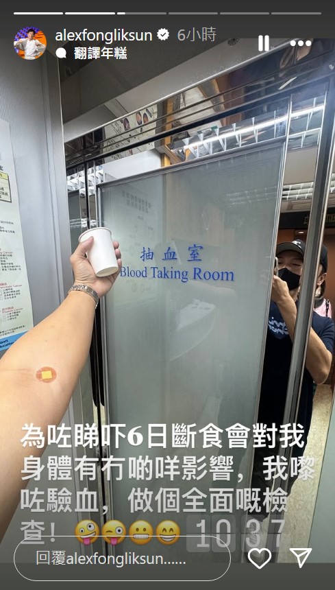 到翌日起床,方力申就現身于診所門外,原來他要驗血:“為咗睇嚇6日斷食會對我身體有冇啲咩影響,我嚟咗驗血,做個全面嘅檢查”于圖片所見,戴上Cap帽、穿上藍色短Tee的方力申左前臂貼上膠布,已完成抽血進程。