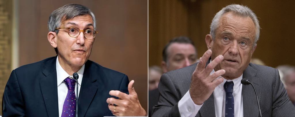 ▲美國FDA首席疫苗專家馬克斯博士(左),因批評衛生部長肯尼迪(右),“持續散布對疫苗的錯誤、撒謊”,被迫自請辭職。美聯社