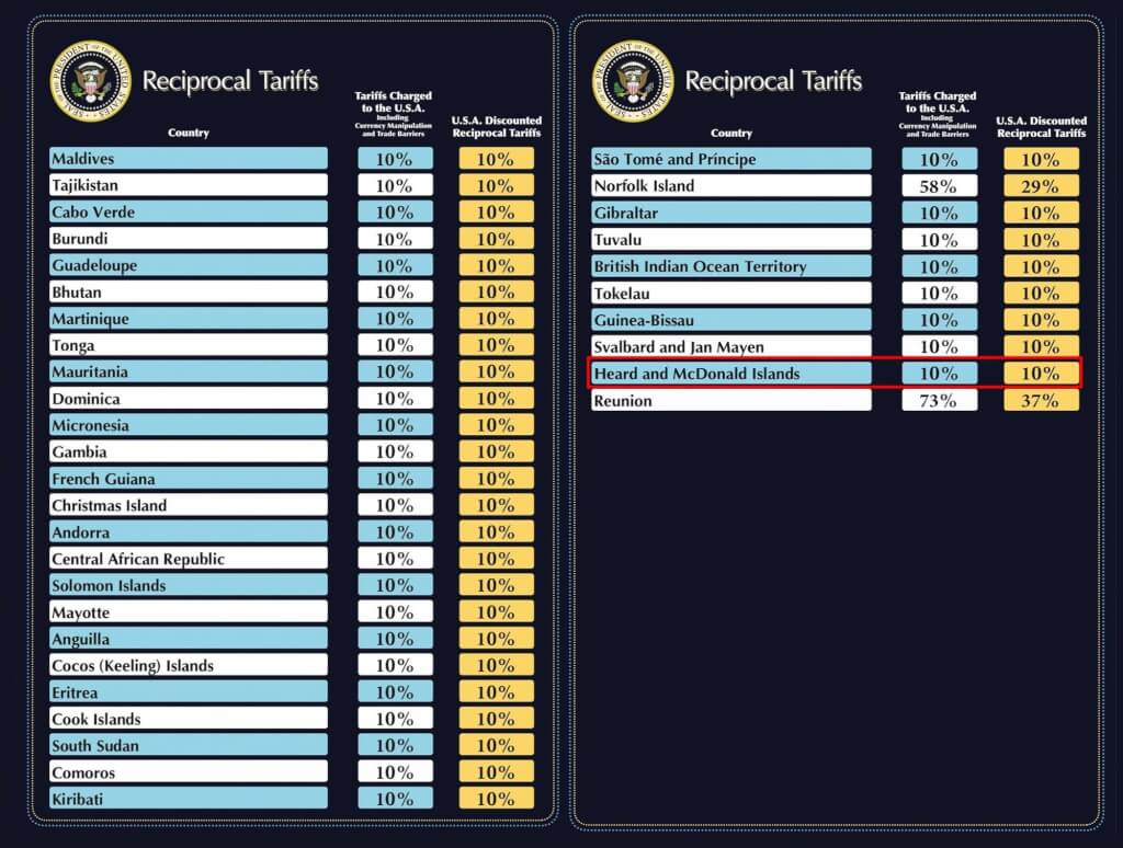 其中,靠近南極的澳洲無人島屬地赫德島和麥克唐納島(Heard and McDonald Islands,名單倒數第二項),也即將要面臨來自美國10%的關稅。