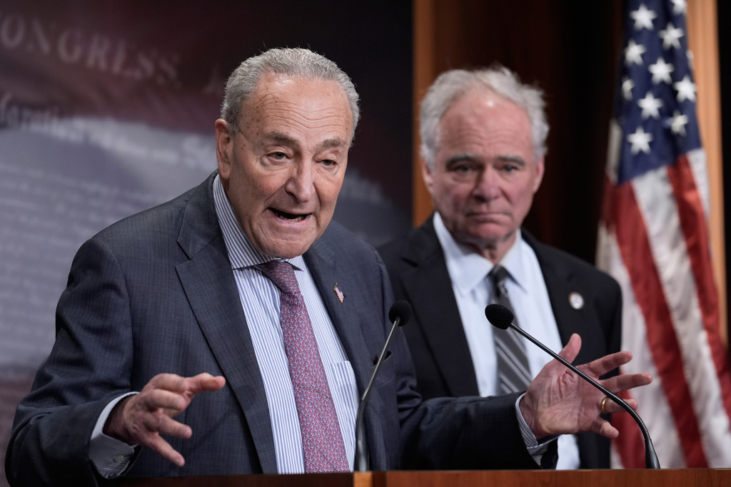 ▲美參議院少數黨領袖舒默(左)在特朗普宣布重大關稅消息前幾小時舉行記者會,抨擊特朗普的關稅“解放日”。(美聯社)