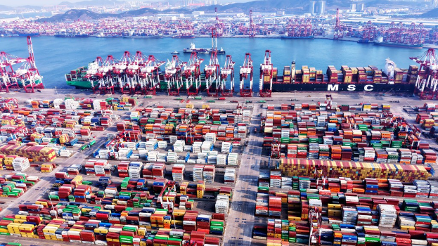 ▲青島港堆滿準備出海的貨柜?!⌒氯A社