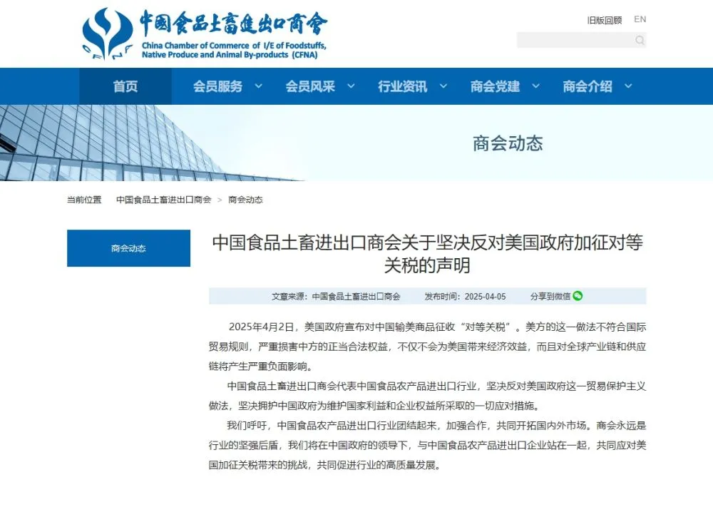 中國食品土畜進出口商會關于堅決反對美國政府加征對等關稅的聲明