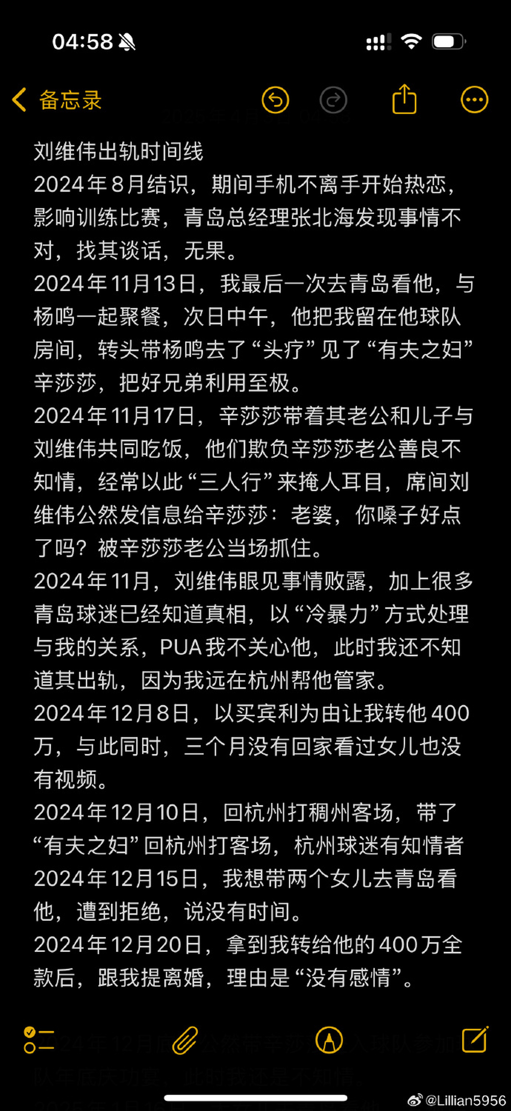 劉維偉在事情暴露前,已開始對妻子李艷冷暴力及PUA。報道指,去年12月8日,劉維偉以買賓利為由讓妻子轉款400萬,此時已長達3個月沒回家看望女兒。12月20日,劉維偉收到400萬后提出離婚,理由是“沒有感情”。12月底劉維偉公然帶辛某出入球隊,此時李艷仍不他已出軌人妻。