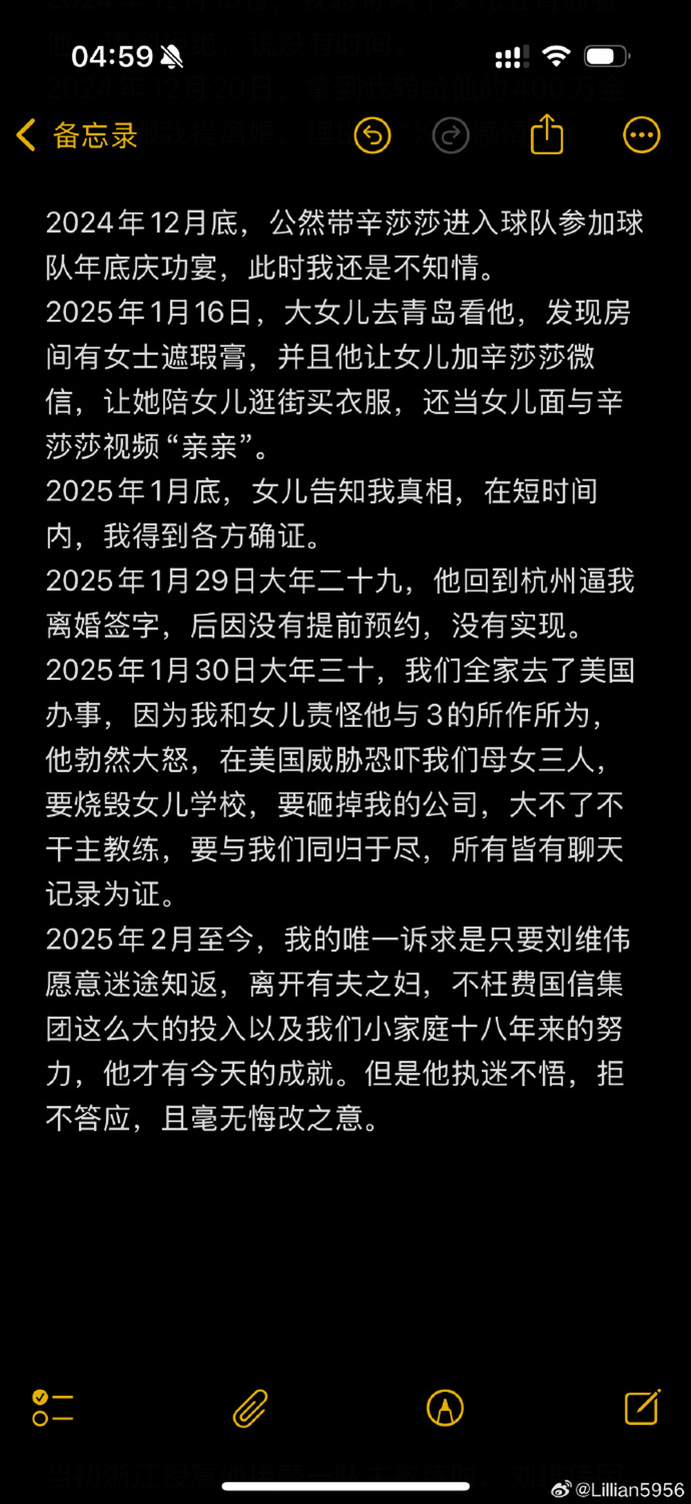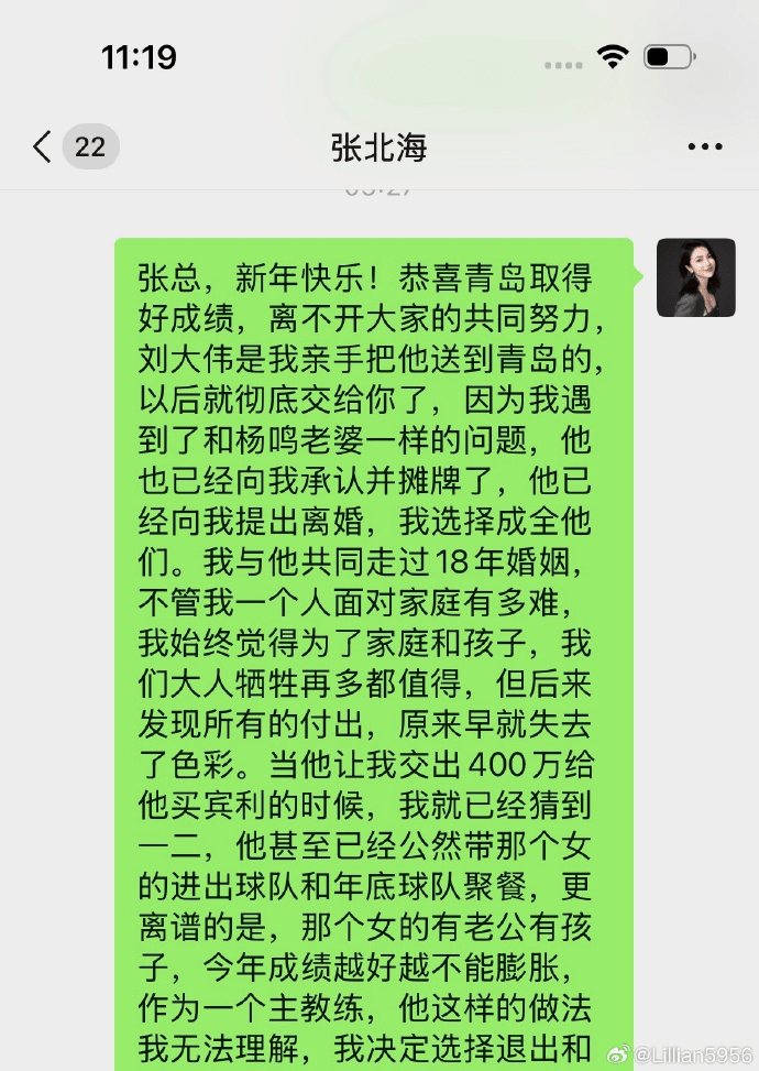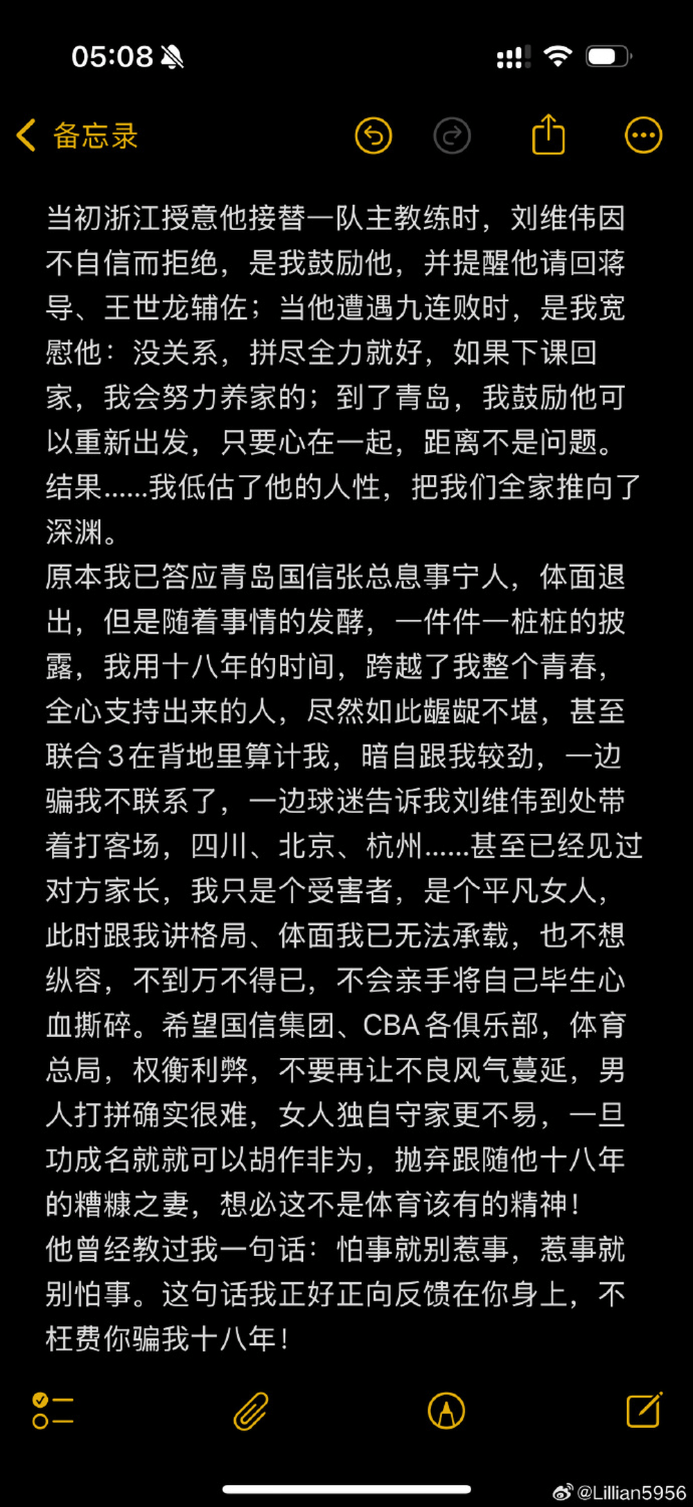 CBA青島國信海天男籃主教練劉維偉的妻子李艷在個人社交媒體上爆料,稱劉維偉公然帶著人妻“小三”辛莎莎出入球隊,甚至當著女兒的面與小三視頻“親親”。劉維偉不僅長時間未回家,還恐嚇要砸妻子公司,放火燒女兒的學校,并在以購買賓利汽車(Bentley)為由要她轉了400萬(人民幣,下同)后,在過年前逼她簽字離婚。而劉維偉出軌,青島男籃總經理張北海和遼寧男籃主帥楊鳴都知情。
