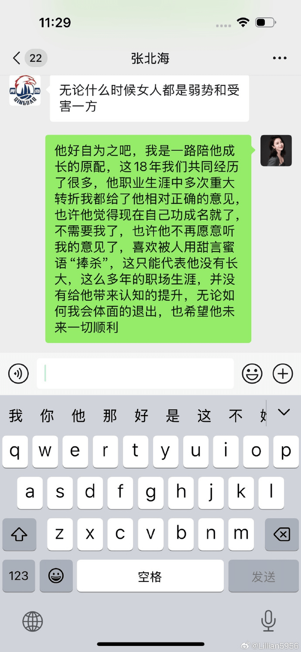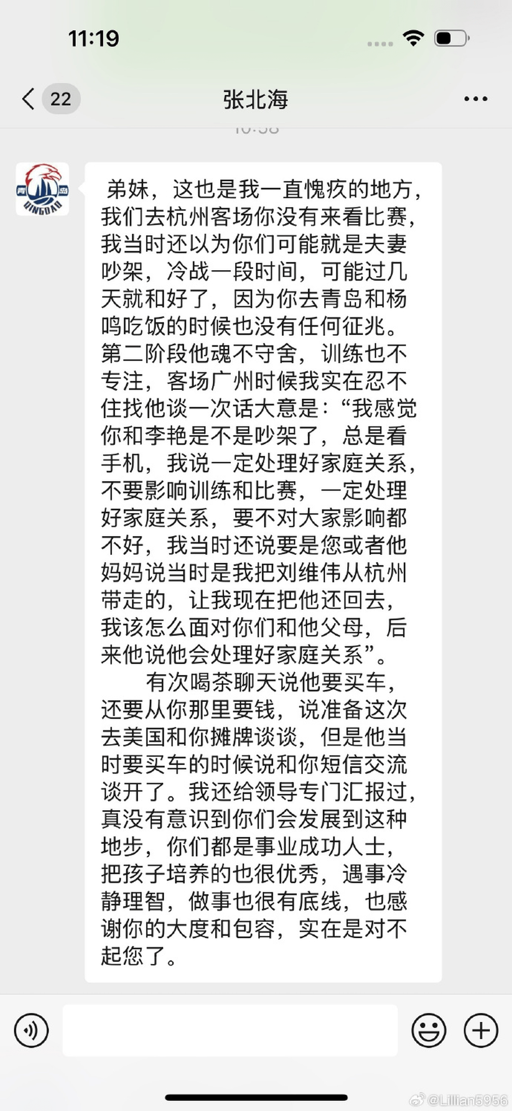 李艷更曬出與青島男籃總經理張北海的聊天記錄。記錄顯示,張北海承認對劉維偉的行為知情,并表示“很愧疚”“曾多次指責他”。這一信息讓外界質疑球會是否對劉維偉的私德問題“只眼開只眼閉”。