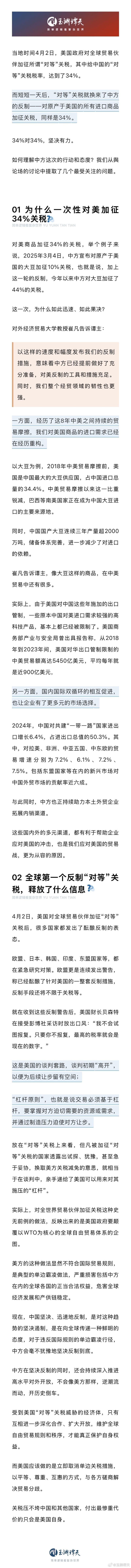 央視旗下新媒體“玉淵譚天”5日報導,中方4月4日11箭齊發,堅決反制美國加征的對等關稅。其中,中方宣布,對原產于美國的所有進口商品加征34%關稅?!?4%”和“所有”都引發輿論廣泛討論。大家最關心的問題:一是為什么一次性對美加征34%關稅?二是全球第一個反制對等關稅,釋放什么資訊?