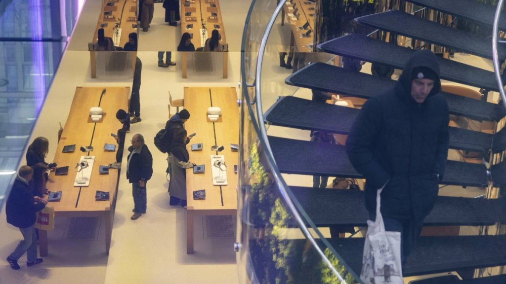 ▲有美國民眾擔心關稅會導致蘋果iPhone加價,紛紛到門店購買。美聯社