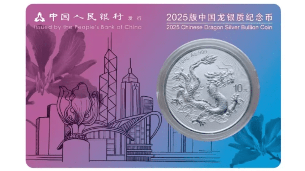 “2025版中國龍銀幣”由中國人民銀行發行、深圳國寶造幣有限公司鑄造,是中華人民共和國法定貨幣,含純銀31.104克,直徑38毫米,面額人民幣10元,成色99.9%。紀念幣正面圖案為鳥瞰視角的長城,并刊國名、年號;背面圖案則以中華民族的圖騰—中國龍為主,輔以祥云元素構成。香港成為繼新加坡后全球第二個發行“城市版”的地區,所有城市版編號0001的中國龍銀幣將永久收藏于北京的博物館。