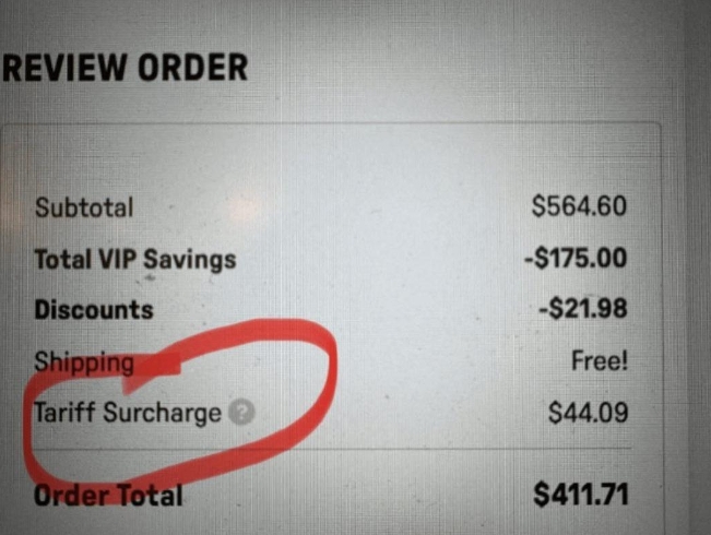 近日,一名美國網友曬出一張服裝公司Fabletics的消費收據,收據上明確標注了一項增收的“關稅附加費”。