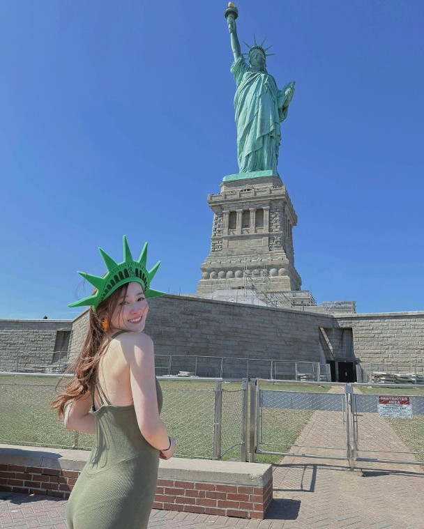 ▲化上淡妝的李蘊披著一頭啡金色微卷長發,頭戴自由女神綠色頭箍,并在5度低溫下身穿軍綠色吊帶修身連身長褲,站在紐約自由女神像景點留影。