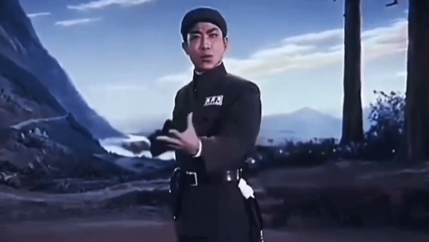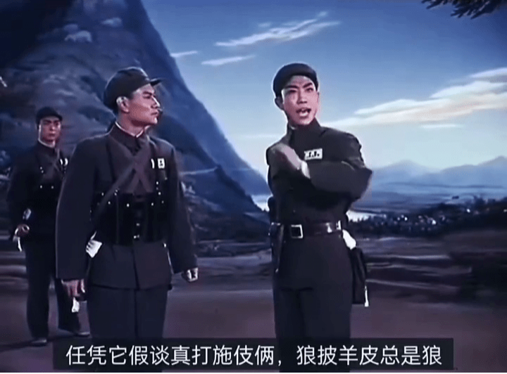 “美帝野心實狂妄,夢想世界逞霸強。失敗時它笑里藏刀和平講,一旦間緩過勁來張牙舞爪又發瘋狂”,京劇演員宋玉慶扮演的主角嚴偉才唱道,“任憑它假談真打施伎倆,狼披羊皮總是狼。對敵從不抱幻想,我們還要更警惕,緊握槍,打敗美帝野心狼!”