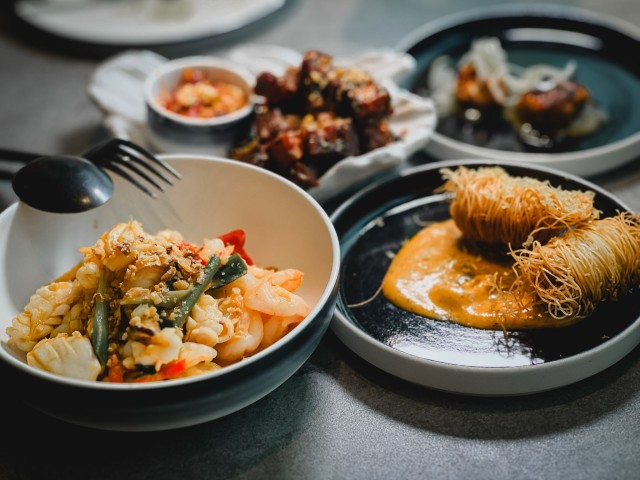 早午餐以無限任添的精致開胃菜揭開序幕,意式鮮魚片配秘制XO醬,港式XO醬的海味、辛香與鮮魚片的濃厚油香完美結合,口感層次豐富; 泰式香草咸蛋黃炒鮮蝦及魷魚,將咸蛋黃的濃郁香氣,拌炒到海鮮之中,口感相得益彰。 脆皮豬腩肉配香茅椰菜沙律,豬腩肉炸得酥脆干身,搭配清爽的香茅椰菜沙律,帶點泰式風味。