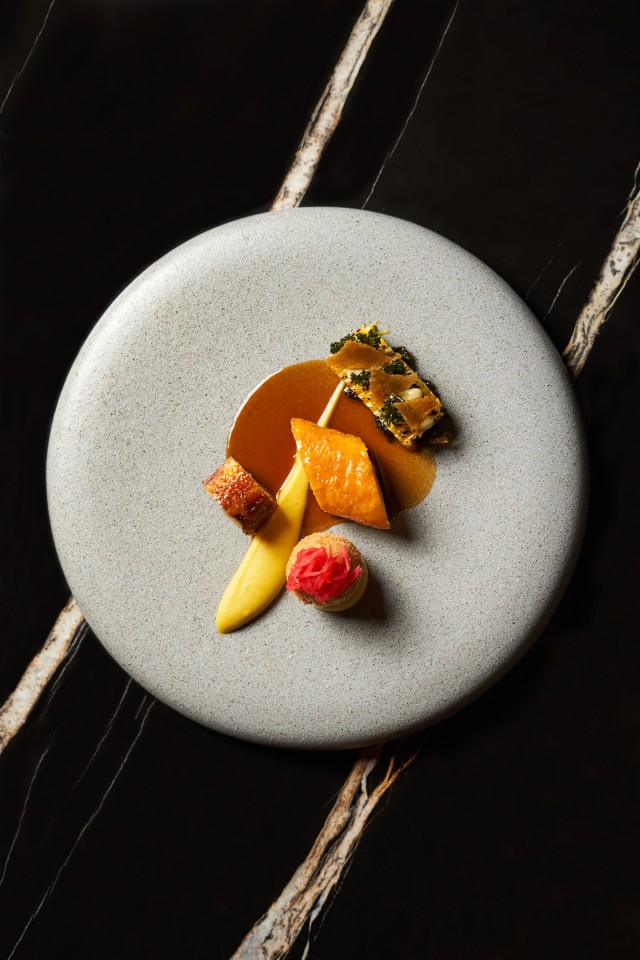 頭盤的選擇有凍意式云吞配煙熏螯蝦、日本A4和牛伴龍蝦油法式面包多士,以及日本紅帝王蟹蛋泡沫等,屬清甜鮮美的開胃西餐。 主菜選材豐富,例如西班牙紅蝦配北非小米,佐以乾魷魚及夏威夷果仁醬,并有慢煮羊肉配卡蒙貝芝士番薯醬、美國頂級牛柳配香煎山楂鵝肝等,菜式利用配搭得宜的食材及自制醬汁,展現地道歐陸菜濃郁鮮香的飲食精髓。