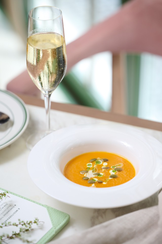 融入了地中海風味的意大利菜餐館JUNO,由西班牙籍行政總廚Jordi Vallés Claverol負責設計餐單,他最近新推的4道菜周末早午套餐($308/位),可供客人自選兩款前菜、一份主菜及甜品。 Jordi拿手炮制富有南歐煮食風格的西餐,像是胡桃南瓜湯、鷹嘴豆泥、龍蝦和大蝦煎蛋餅、海鮮砂鍋西班牙式短面及塔丁蛋糕等。