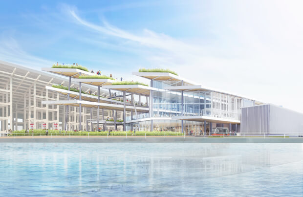 國際交流廳由創立百年的安井建筑事務所和以綠建筑聞名的平田晃久建筑事務所聯合設計,多層次結構模擬自然地形,戶外空間與室內場館交融,綠意盎然的植物點綴其中,搭配大面積玻璃與植生墻,營建自然氛圍。