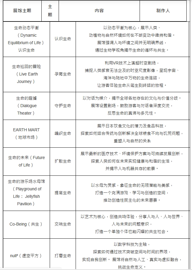大阪世博的8大主題展館(Signature Pavilions),由8位跨領域的日本頂尖制作人制作,涵蓋“認識生命”“孕育生命”“守護生命”等多元視角,打造實體與虛擬結合的沉浸式體驗。